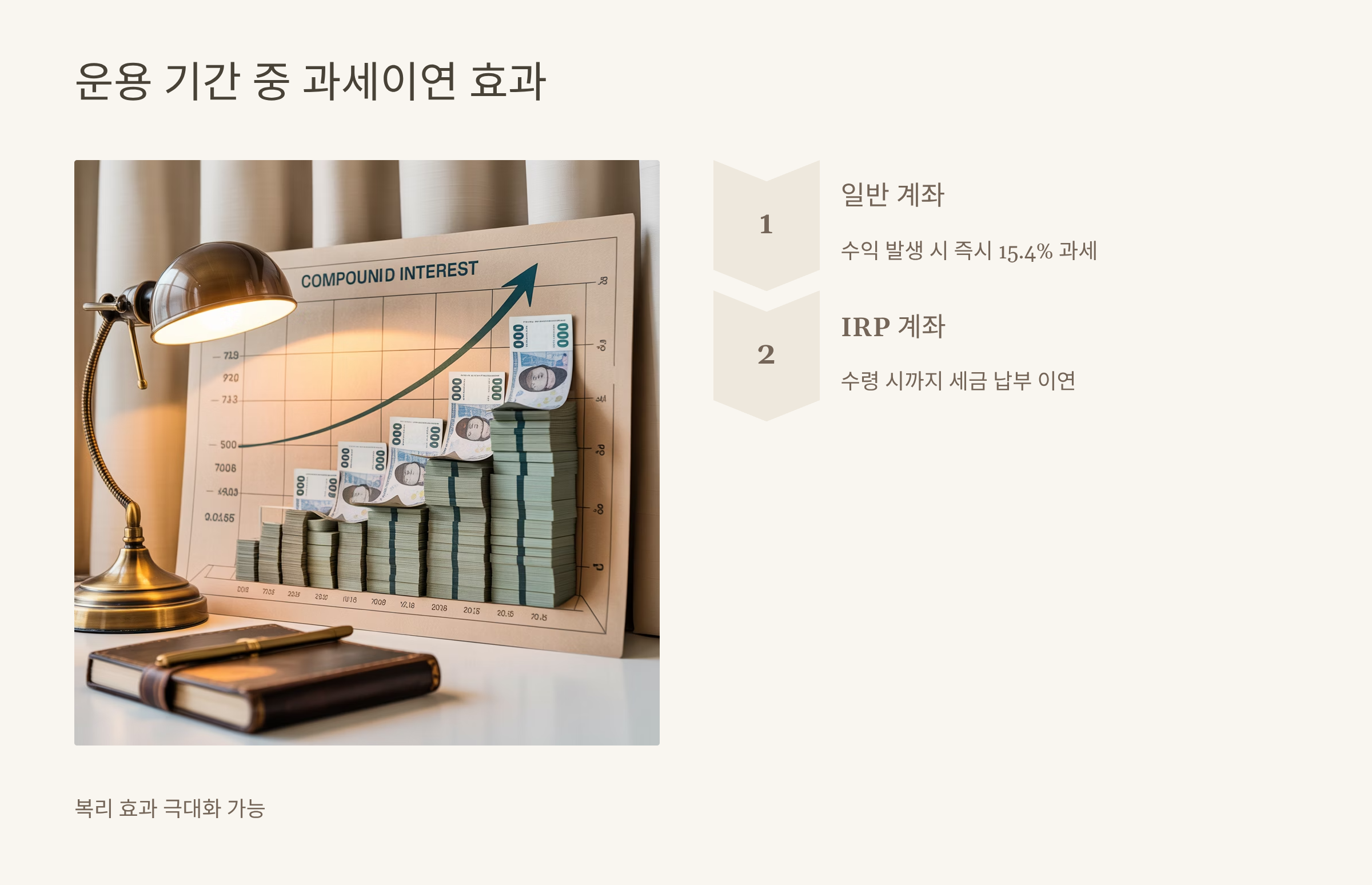 일반 투자 계좌에서는 ETF나 펀드 수익에 대해 15.4%의 세금을 즉시 납부해야 하지만, IRP 계좌 내 운용 수익은 과세가 이연됩니다. 세금을 바로 내지 않고 재투자에 활용할 수 있어 복리 효과를 극대화할 수 있습니다.