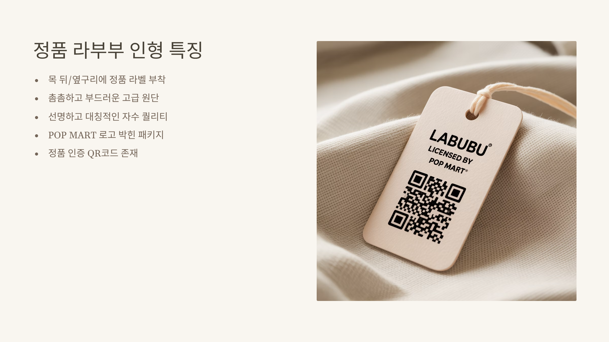 - 라벨: ‘POP MART’ 또는 ‘LABUBU’ 라이선스 표시 여부