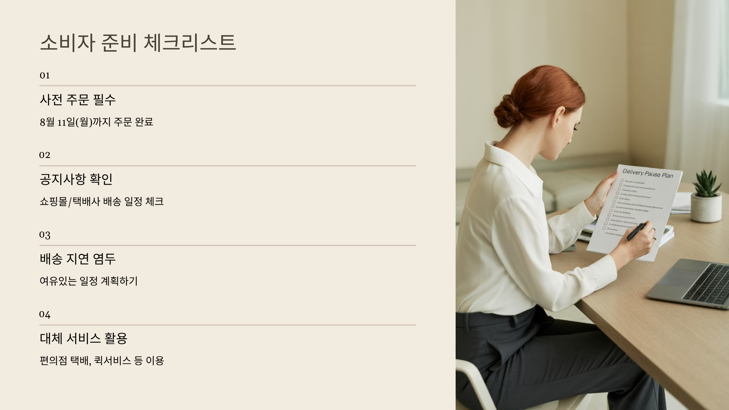 쇼핑몰이나 택배사 홈페이지에서 주문 마감일과 배송 재개일을 꼭 확인하세요. - 지연 가능성 염두에 두기