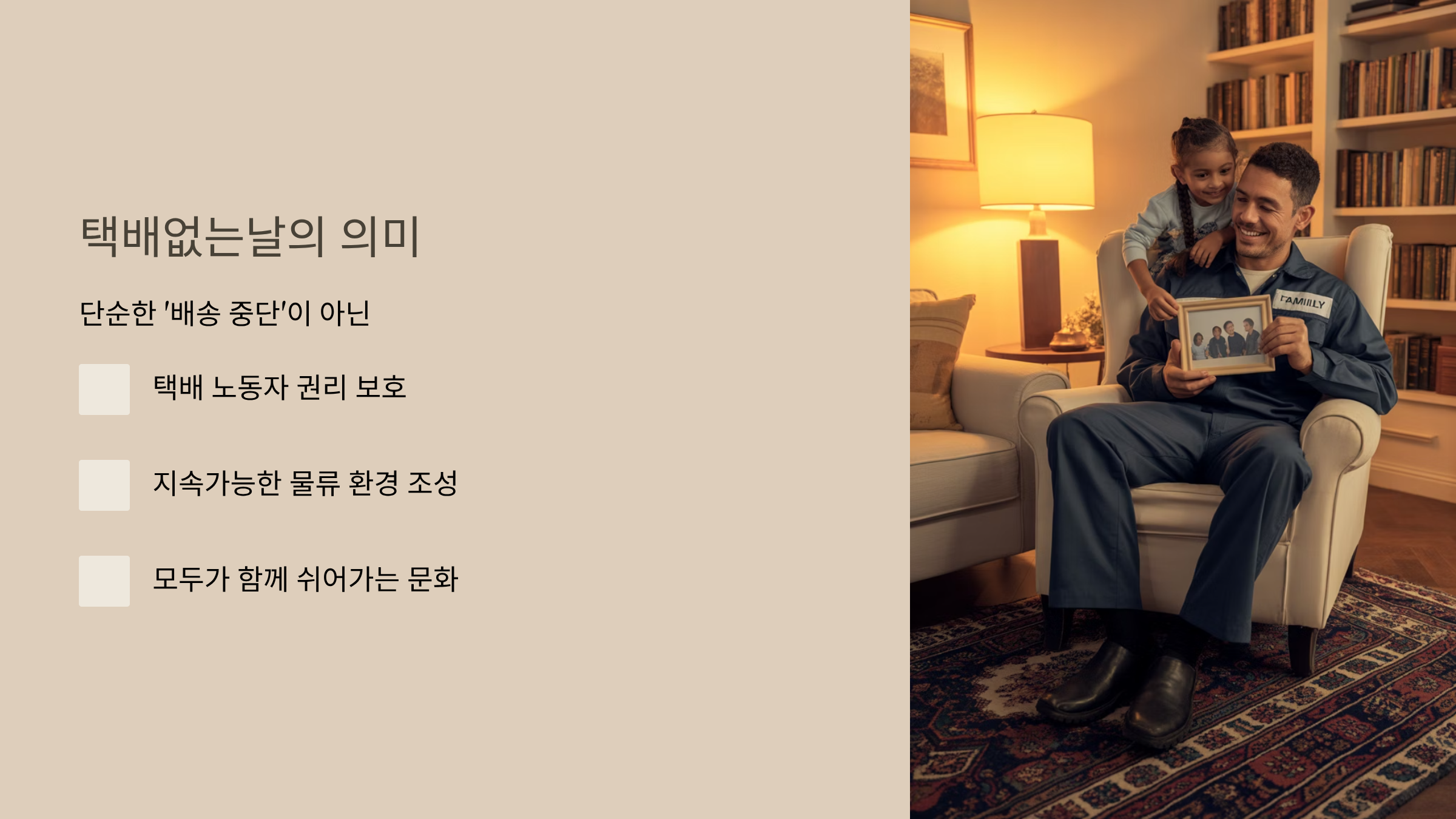택배없는날은 우리 일상과 밀접한 택배 노동자분들의 권리를 보호하고, 지속 가능한 물류 환경을 만들기 위한 시작점이기도 해요.