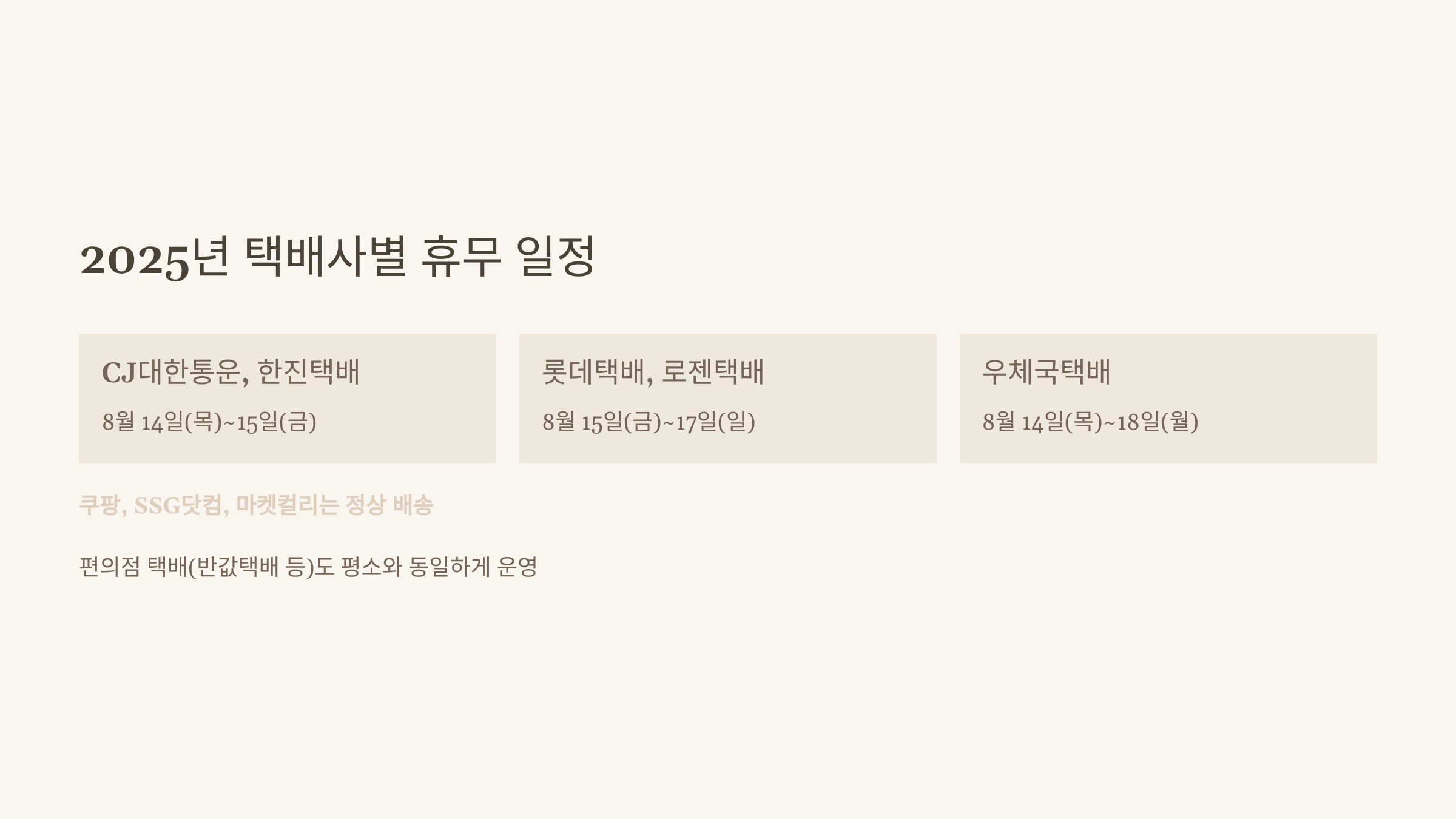 2025년에는 광복절(8월 15일)이 금요일로, 전후 주말을 포함해 대부분 택배사가 휴무를 가집니다.
