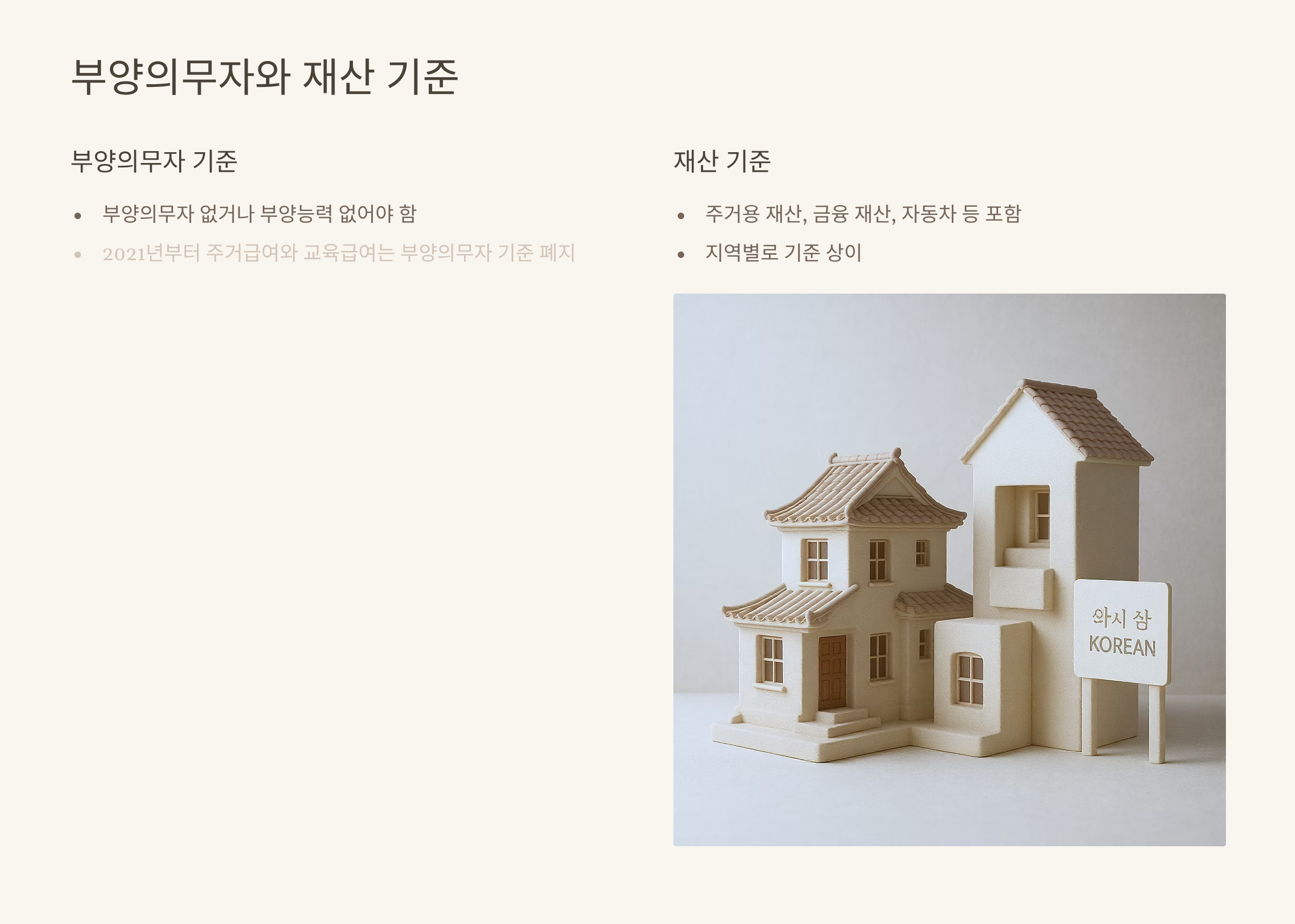 다만, 2021년부터 주거급여와 교육급여는 부양의무자 기준이 폐지되어, 부양의무자가 있어도 해당 급여 신청이 가능해졌습니다. 이는 많은 가구가 실질적인 도움을 받을 수 있게 된 큰 변화로 평가되고 있습니다.