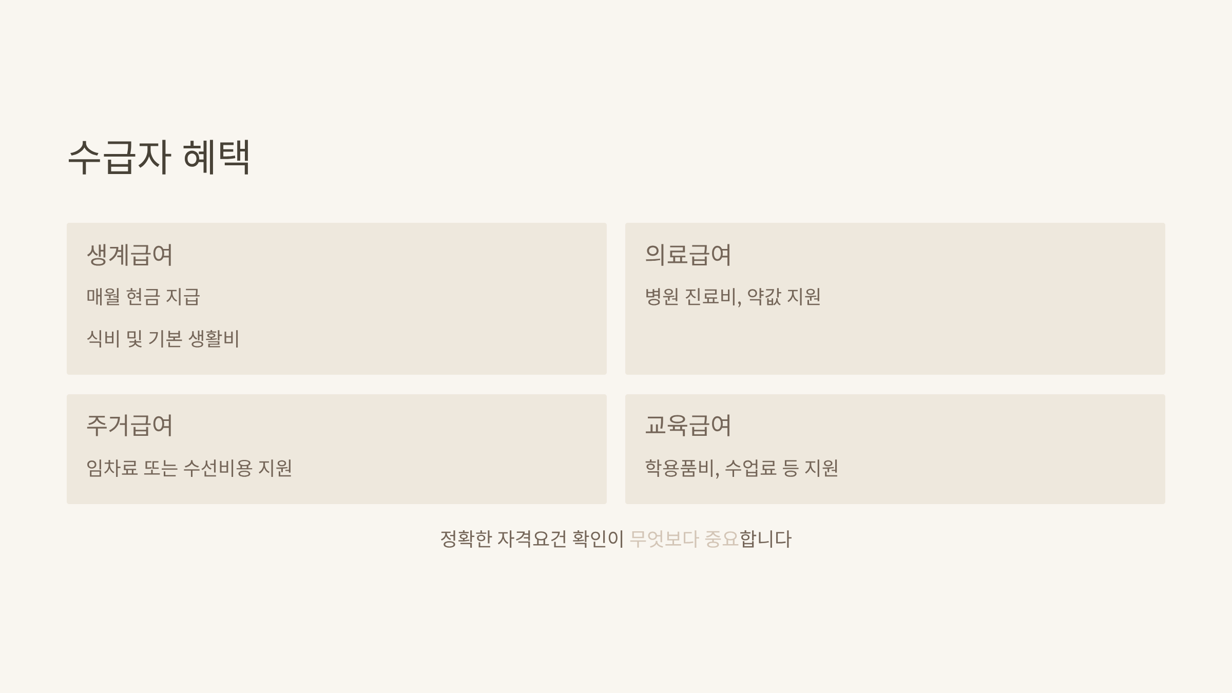 - 의료급여: 병원 진료비, 약값 등을 대부분 국가에서 지원해 줍니다.