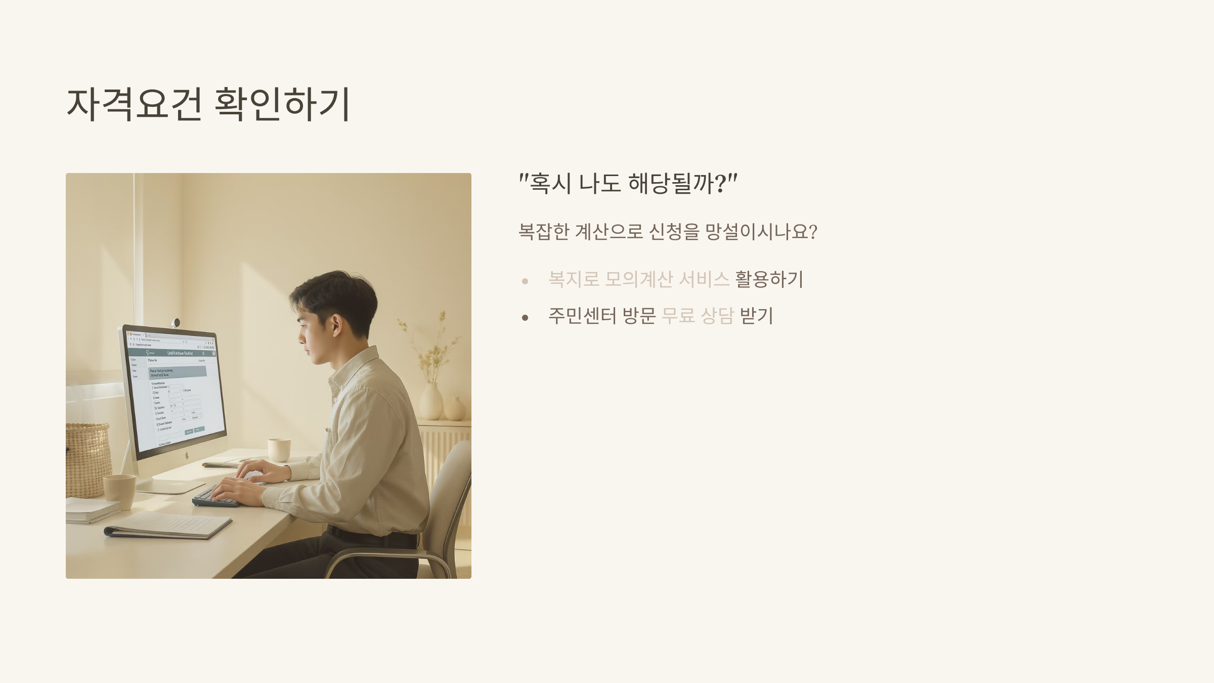 그럴 땐 복지로 모의계산 서비스를 활용해 보세요. 간단한 정보만 입력하면 기초생활수급자 자격요건 충족 여부를 빠르게 확인할 수 있어요. 그래도 어렵다면 관할 주민센터에서 상담을 받는 것이 가장 정확하고 빠릅니다.