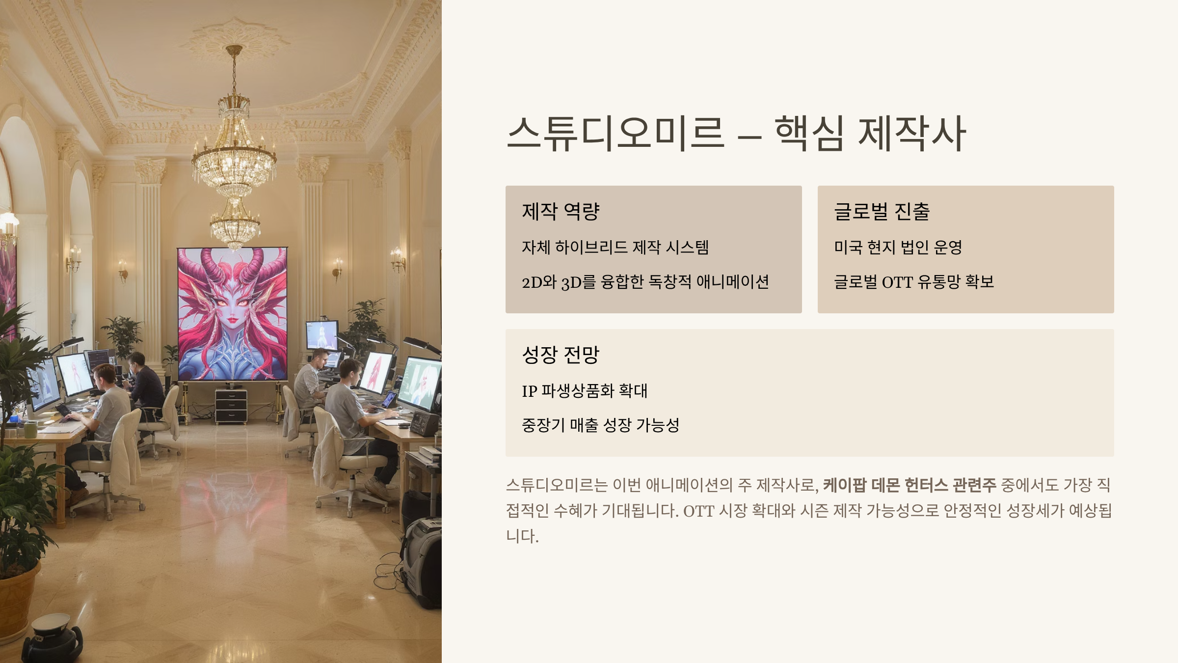 스튜디오미르는 이번 애니메이션의 주 제작사로, 케이팝 데몬 헌터스 관련주 중에서도 가장 직접적인 수혜가 기대됩니다. 자체 하이브리드 제작 시스템을 바탕으로 2D와 3D를 융합한 독창적인 작품을 제작하고 있으며, 미국 현지 법인을 통한 글로벌 유통망을 갖추고 있습니다. OTT 시장 확대와 IP 파생상품화로 중장기 매출 성장이 예상됩니다.