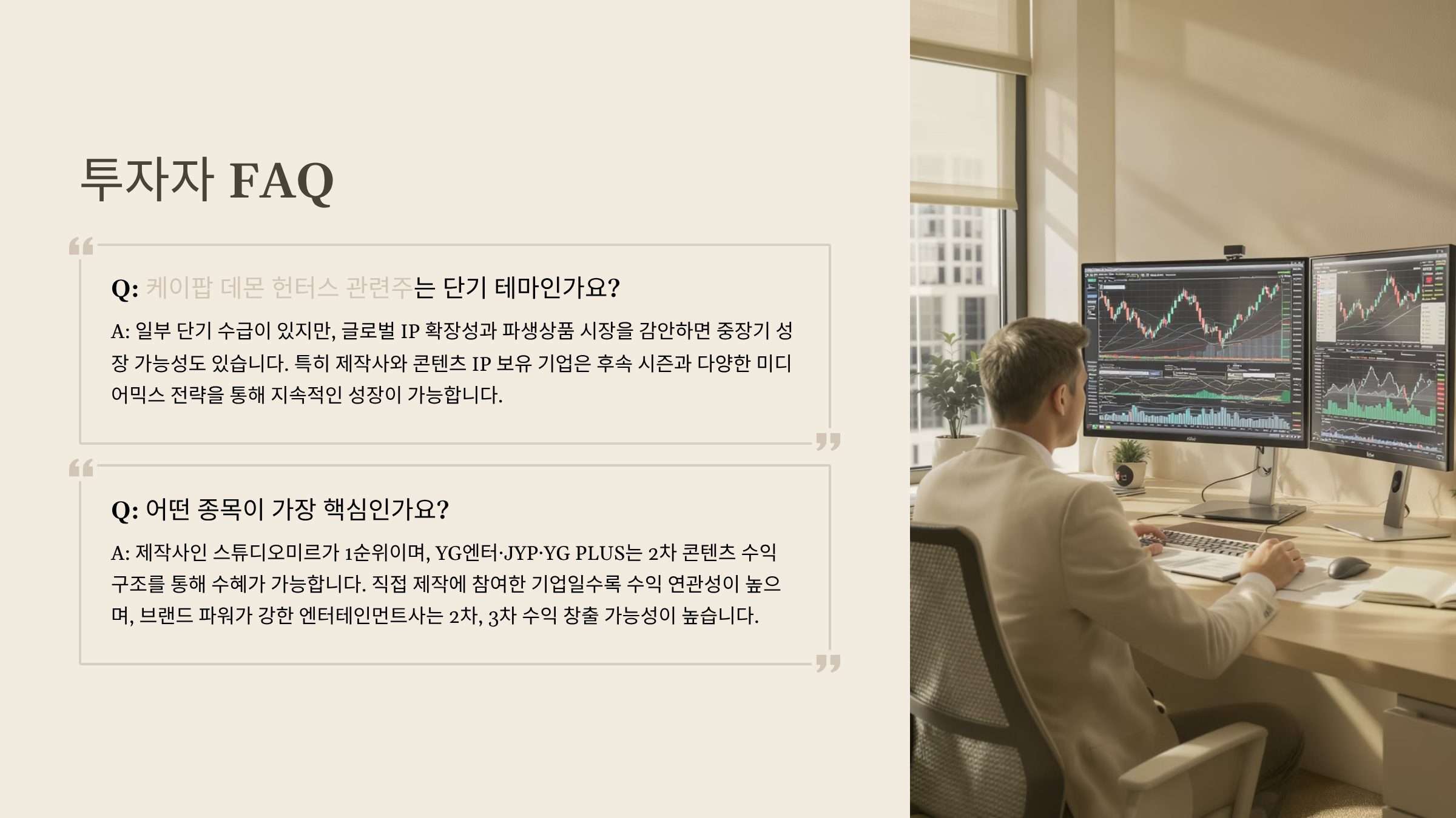 - 후속작 여부: 케이팝 데몬 헌터스 관련주의 중장기 모멘텀은 후속작 제작 여부와 글로벌 시장 반응에 달려 있습니다.