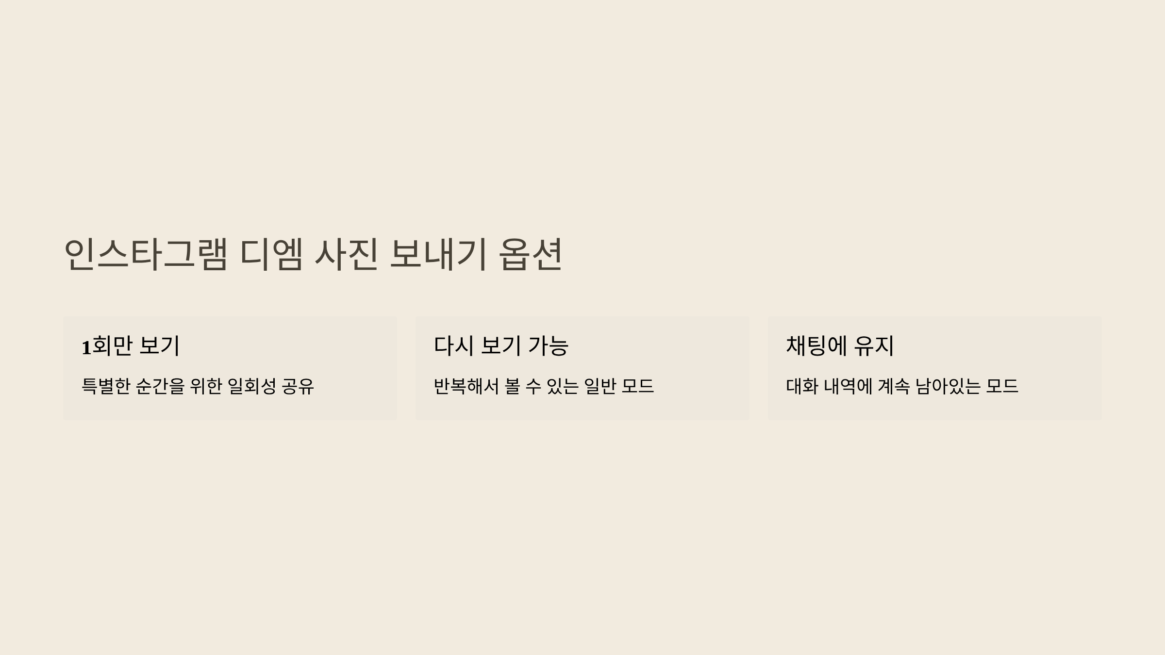 세 가지 옵션 중 선택할 수 있어요. 특히 1회만 보기로 설정하면 인스타 디엠 그림 기능을 사용한 특별한 사진을 단 한 번만 보여줄 수 있어 더 강렬한 인상을 줄 수 있어요.