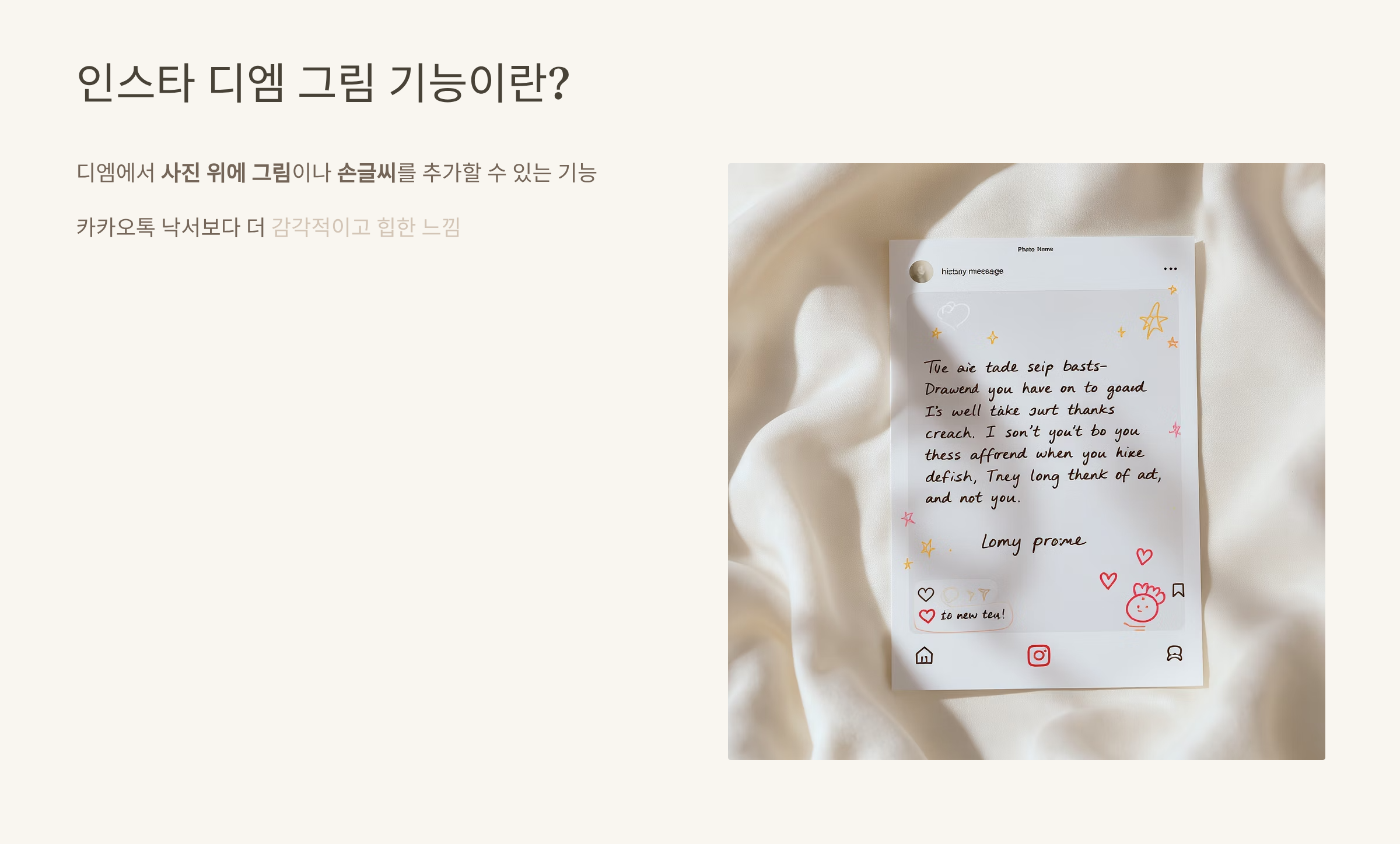 인스타 디엠 그림 기능은 디엠(Direct Message)에서 사진을 보낼 때, 그 위에 그림을 그리거나 손글씨를 쓸 수 있는 기능이에요.